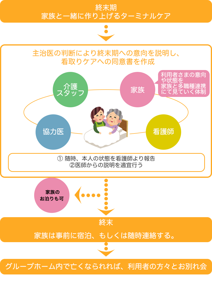 医療連携体制が強みであり医療対応もできるGHとして正看護師が2名おり、介護現場との連携を取って、実際の処置を24時間の中で対応しています。